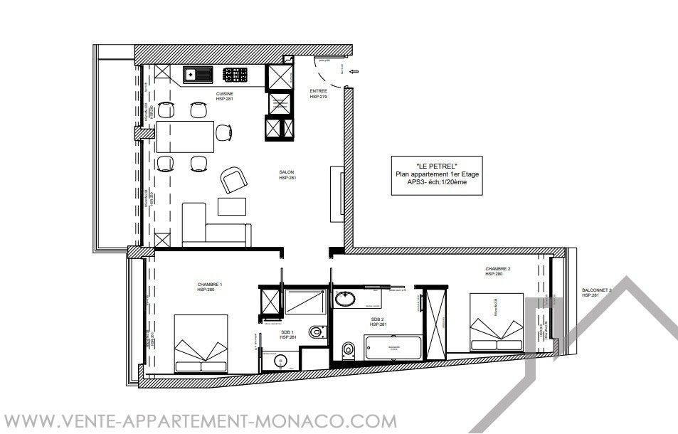 Il se compose de : un hall d'entrée, un séjour avec cuisine ouverte et terrasse, deux chambres et deux salles de bains.