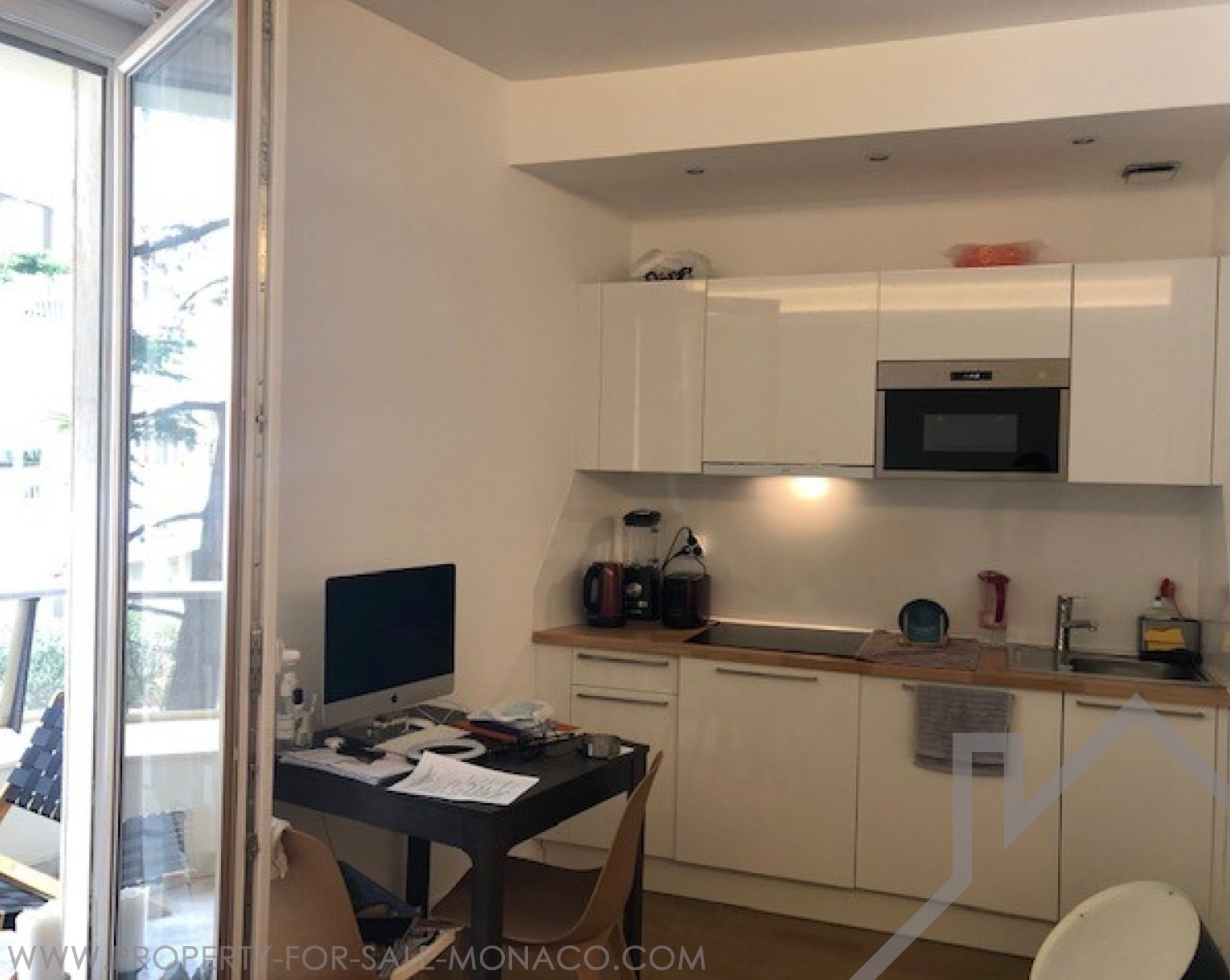 Quartier calme Jardin Exotique, résidence Bel Horizon, studio avec balcon climatisé et service conciergerie.