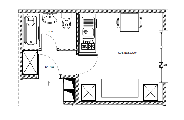 Il se compose de : une entrée avec placard, une pièce principale, emplacement cuisine non équipé, une salle de douche.