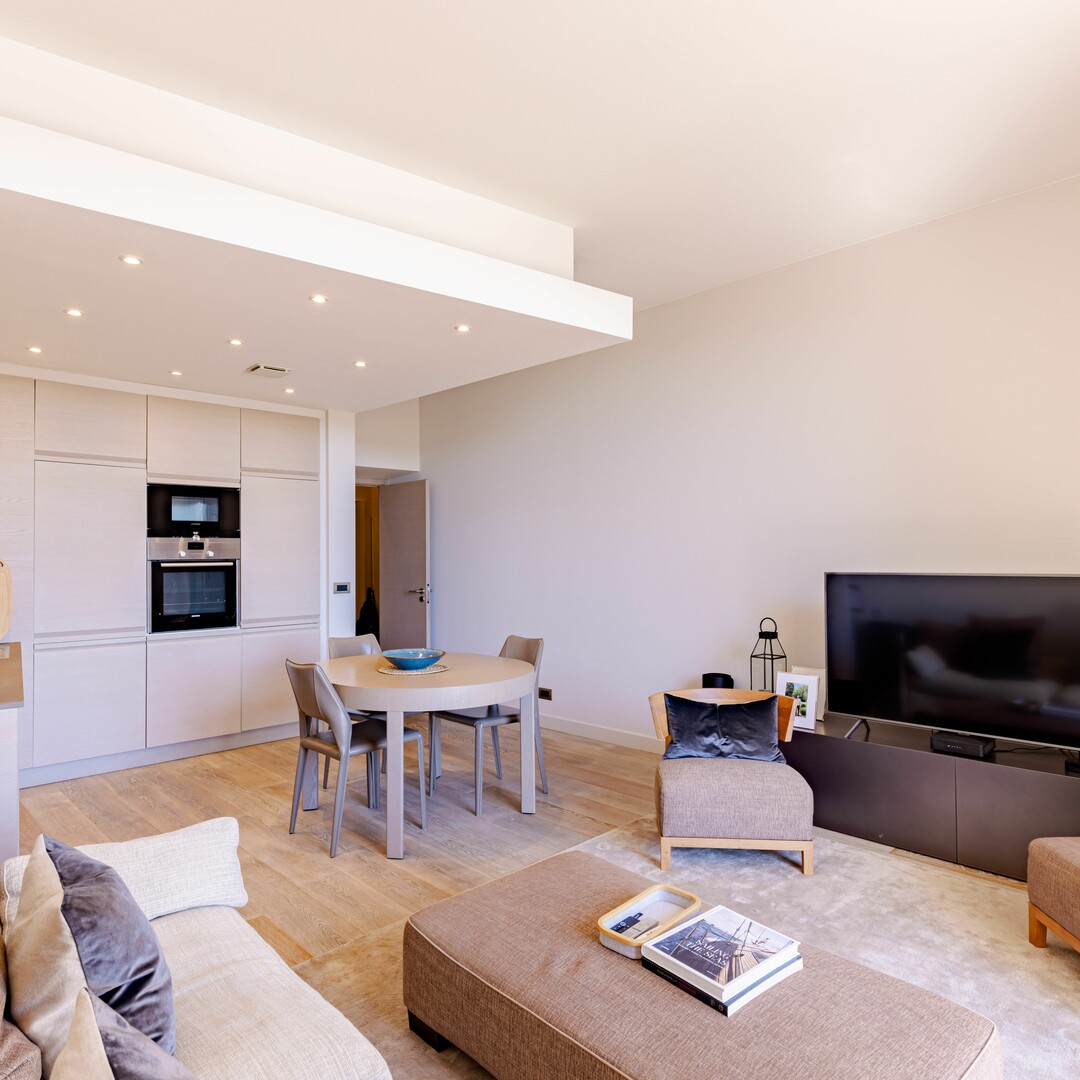 Ce bien d'exception se compose d'un séjour lumineux ouvert sur la terrasse, d'une cuisine équipée avec des finitions de luxe, et d'une spacieuse chambre avec dressing sur mesure. La rénovation complète a été réalisée avec une attention particulière, créant un espace de vie moderne et raffiné.