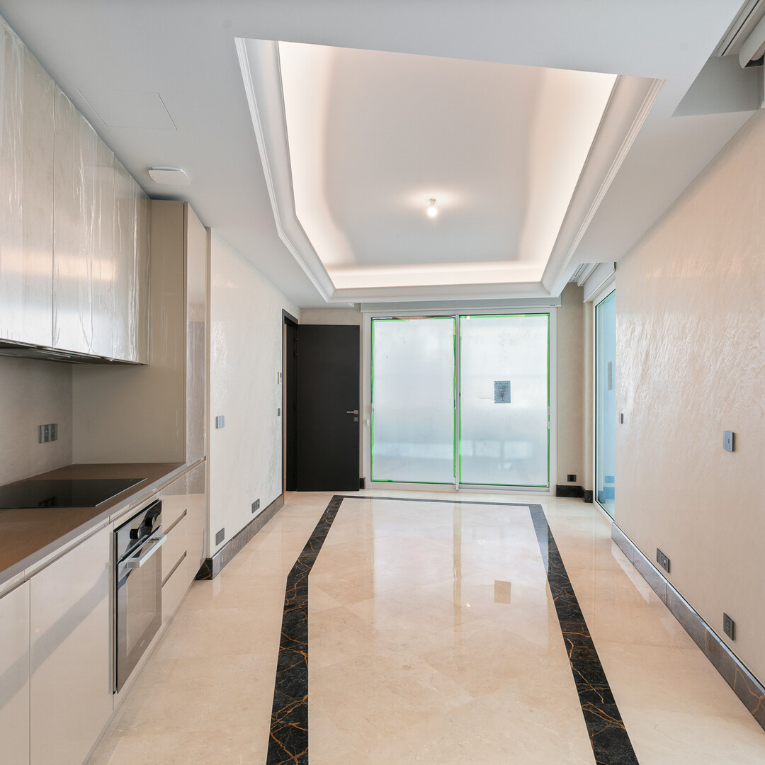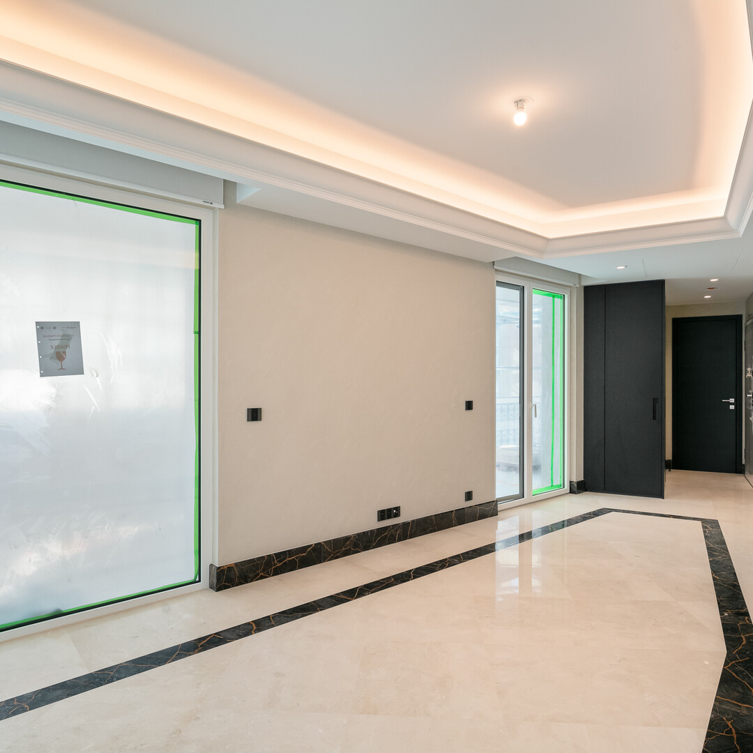 Le séjour lumineux bénéficie de deux marbres différents au sol, du stuc aux murs et d'une corniche rétroéclairée au plafond.