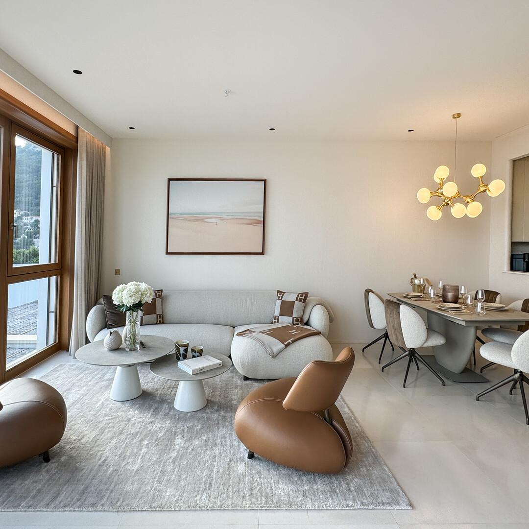 Ce magnifique appartement de trois pièces est vendu entièrement meublé et offre une vue imprenable sur la mer. Grâce à son orientation sud-ouest, l'appartement bénéficie d'un ensoleillement optimal et impressionne par son design de qualité. L'appartement dispose d'un élégant double salon et d'une élégante cuisine entièrement équipée d'appareils de première classe. Le salon s'ouvre sur une terrasse spacieuse où une grande table à manger invite à des soirées conviviales. Un espace salon supplémentaire crée une atmosphère de calme et de détente pour vous et vos invités. La chambre à coucher principale, élégamment aménagée, impressionne par sa taille, sa lumière naturelle et son dressing-couloir qui offre de nombreuses possibilités de rangement, ce qui ravira particulièrement les femmes. La salle de bain en suite avec chauffage au sol est équipée de carreaux de pierre, d'un double lavabo sur mesure, d'une baignoire et d'une douche. Une deuxième chambre avec salle de douche offre également des matériaux de qualité et un design moderne.