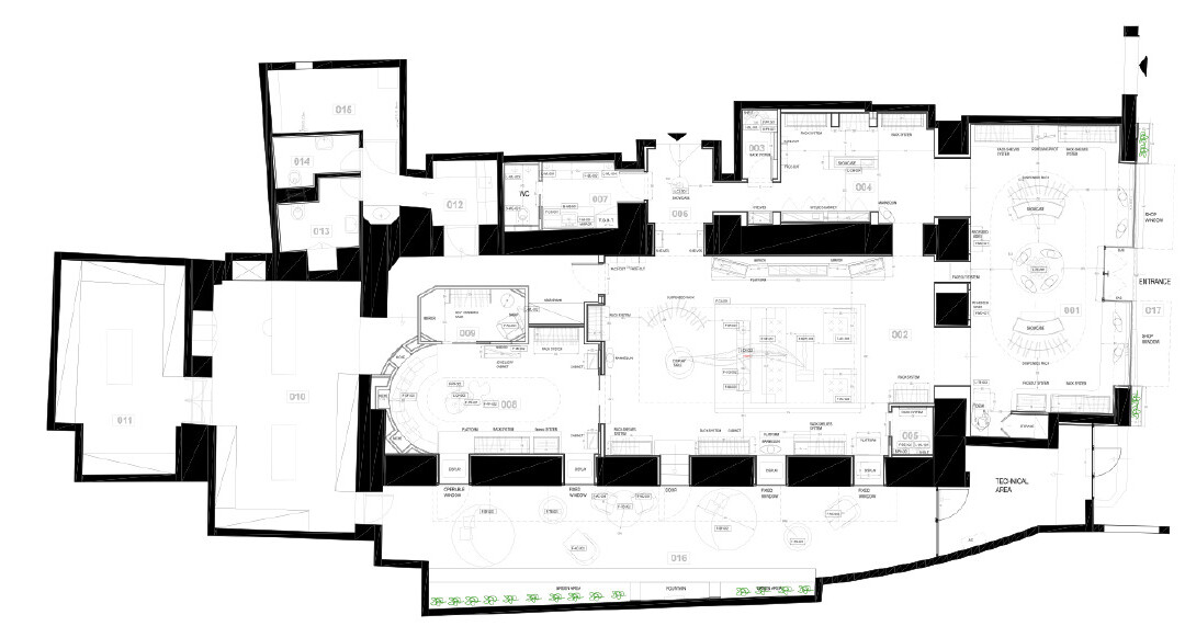 - une entrée, un grand salon, un salon VIP, un petit salon avec sa cabine d’essayage, 1 powder room, des toilettes hommes femmes, un coin cuisine, un bureau, un atelier, un espace de stockage et une terrasse privée