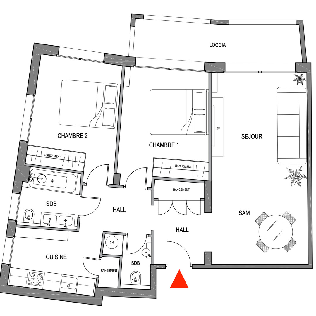 Hall d'entrée, séjour, deux chambres, dégagement, cuisine équipée, salle de bains, toilette indépendant, rangements, climatisation, loggia