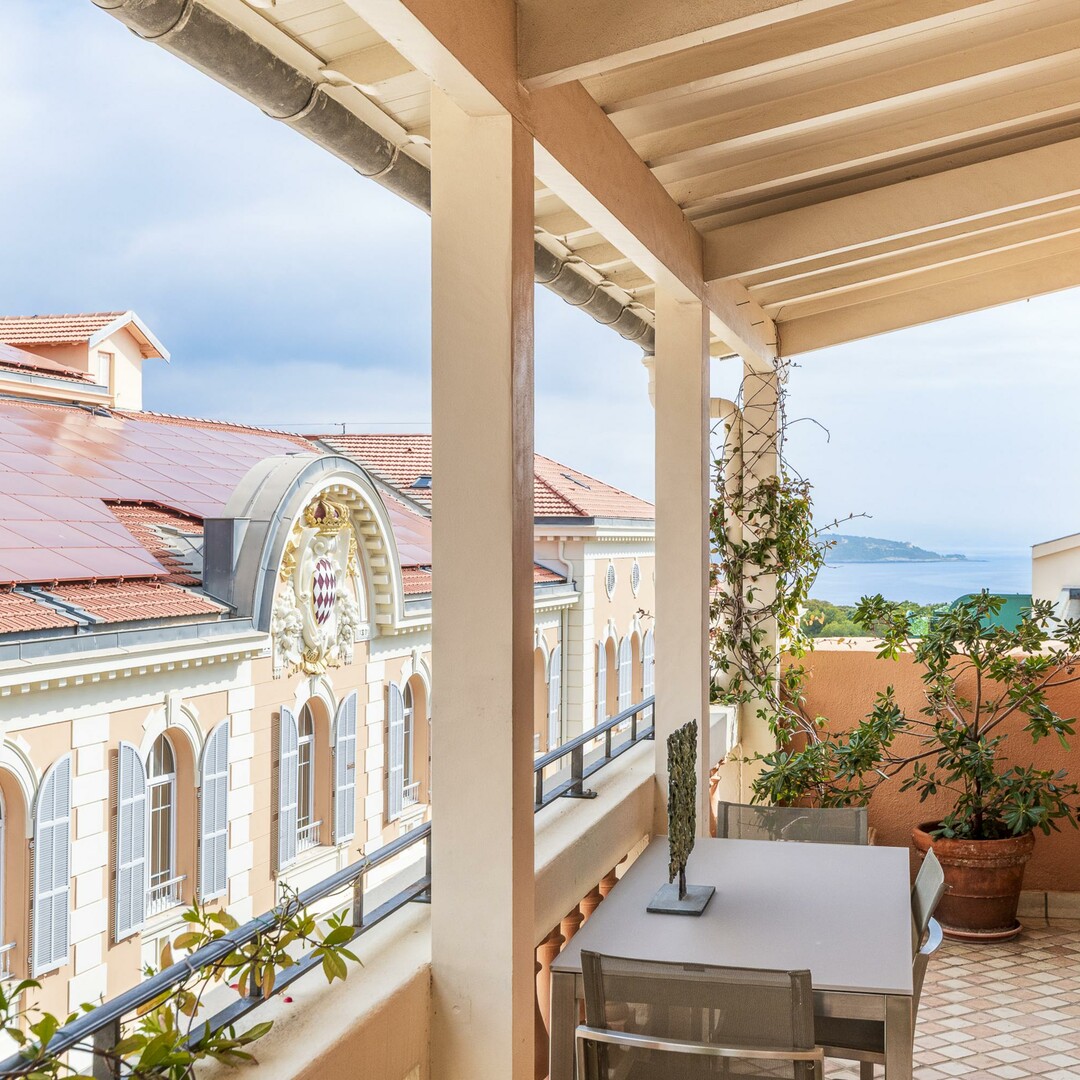 Dés l'entrée, le vaste séjour traversant baigné de lumière avec ses grandes portes-fenêtres offre une belle hauteur sous plafond, le tout s’ouvrant sur une terrasse ensoleillée au charme méditerranéen, parfaite pour des instants de détente face aux toits de Monaco ou à la mer.