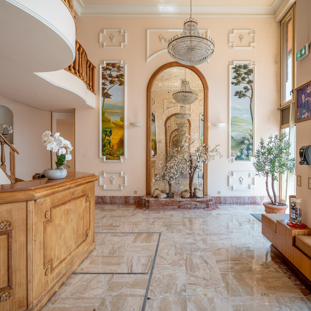 Situé au 6ᵉ étage, cet appartement bénéficie d’une surface habitable de 114,30 m² et de 33,70 m² de terrasses. Entièrement rénové et meublé, il se compose d’une vaste entrée, d’un salon et d’une salle à manger ouvrant sur deux grandes loggias offrant une vue panoramique sur le Casino de Monte-Carlo et la mer. L’agencement comprend également une cuisine séparée, deux chambres, deux salles de bains et des toilettes pour invités.