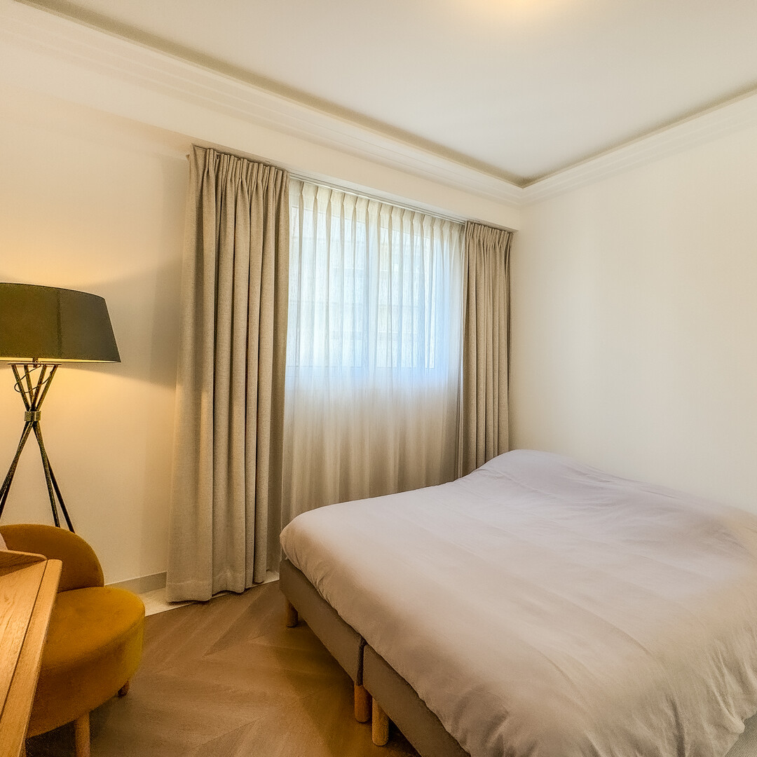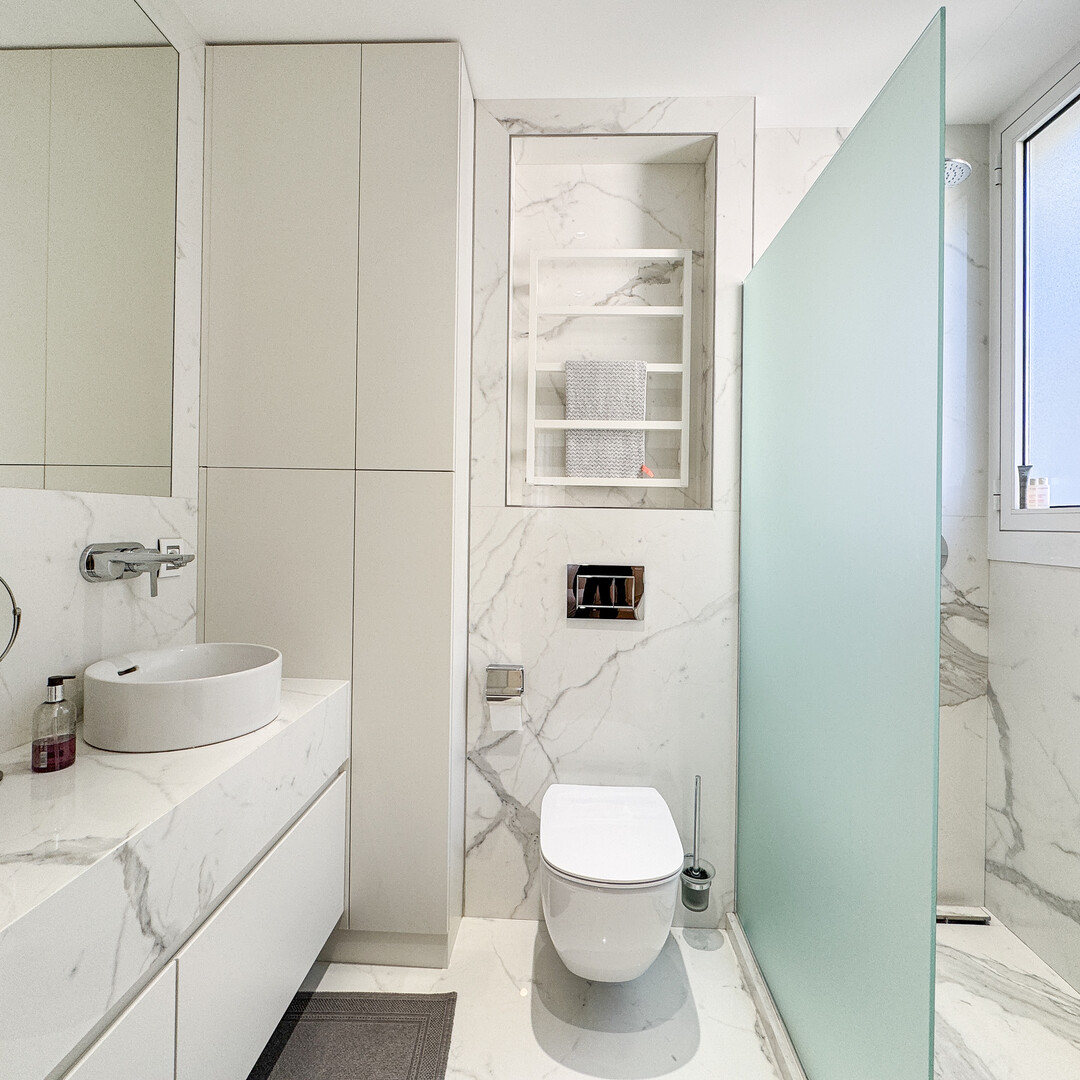 La cuisine, entièrement équipée et meublée, vous séduira par sa fonctionnalité et son style contemporain. La salle de bains en marbre, avec sa double vasque, incarne l’élégance et le confort. L'ensemble de l’appartement bénéficie d'une climatisation intégrée, assurant un confort optimal en toutes saisons.
