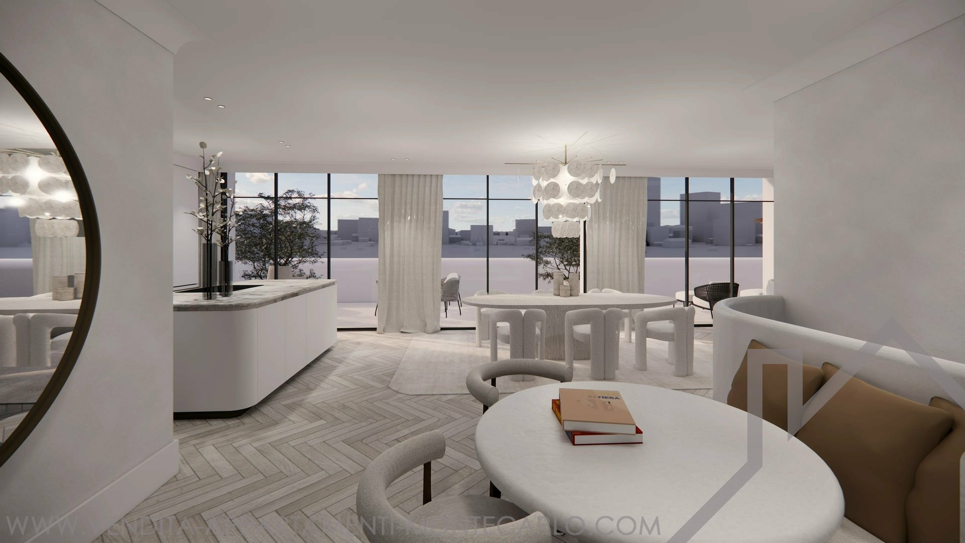 Le vaste séjour et la salle à manger baignent dans une lumière naturelle. Cet espace de vie élégant s'étend sur une cuisine ouverte, entièrement équipée d'appareils électroménagers de marques prestigieuses, ainsi que sur deux vastes terrasses, idéales pour savourer des moments de quiétude et de détente.