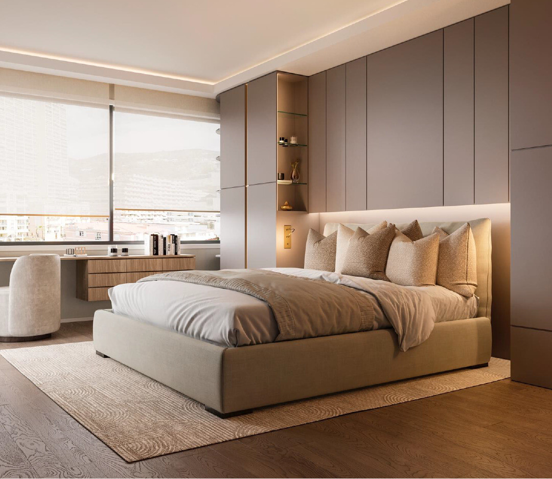 d’une entrée, d’un séjour lumineux ouvrant sur une grande terrasse de plus de 30 m² offrant une vue imprenable sur la mer et le Casino, d’une cuisine aménagée et équipée, ainsi que de deux chambres en suite avec leurs salles de bains et un WC invité.