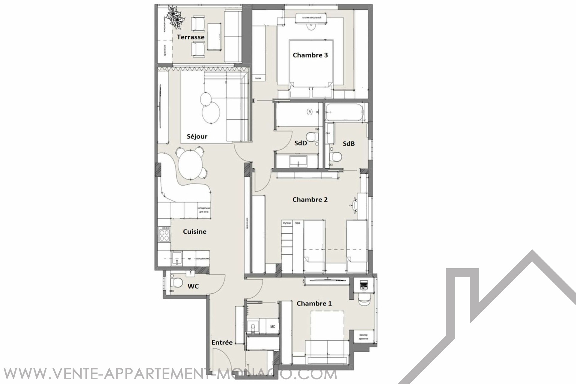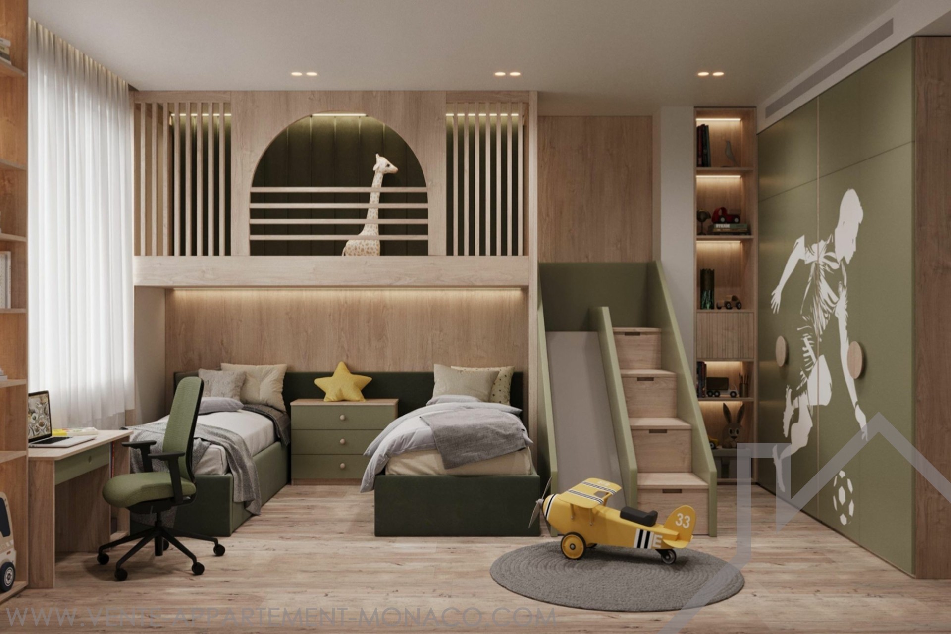 L'appartement comprend deux chambres principales avec placards ainsi qu'une pièce supplémentaire parfaitement adaptée pour deux enfants, salle de douche complète, salle de bain, buanderie et salon avec cuisine américaine équipée. Immeuble bourgeois avec ascenseur et service de conciergerie.