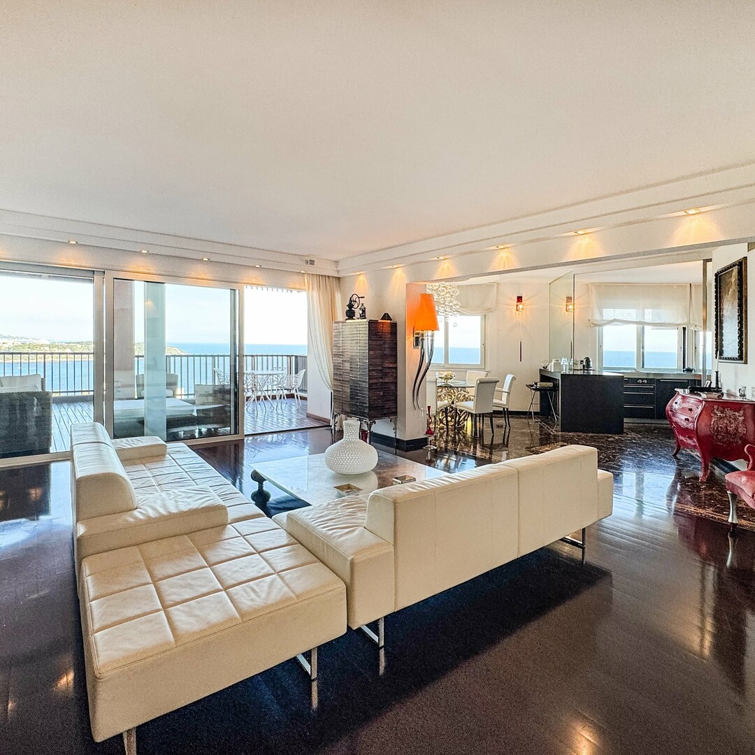 Superbe appartement de 4/5 pièces, idéal pour une famille, situé au sein d'une résidence de standing, dotée d'un service de conciergerie disponible 24h/24 et propose des équipements exceptionnels, notamment une piscine privée réservée aux résidents. Ce cadre de vie privilégié assure sécurité et tranquillité dans un environnement chic et raffiné. Situé en étage élevé, cet appartement bénéficie d'une vue imprenable sur la mer grâce à une magnifique terrasse, offrant un panoramas à couper le souffle tout au long de la journée. Récemment rénové avec des matériaux nobles, ce bien spacieux et lumineux allie élégance et confort. L'appartement propose un agencement idéal, comprenant un vaste double séjour, une cuisine équipée, des chambres spacieuses et un bureau discret et fonctionnel. Ne manquez pas cette occasion rare d'acquérir un bien d'exception, alliant confort, prestige et vue panoramique sur la mer. Ce bien est proposé à la vente avec 2 parkings et 1 cave.