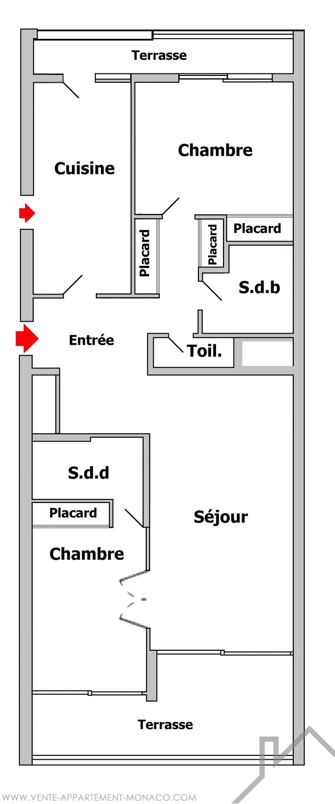 Entrée, séjour, deux chambres, salle de bains, salle de douche, toilettes invités, cuisine équipée, nombreux rangements, climatisation, terrasse, balcon
