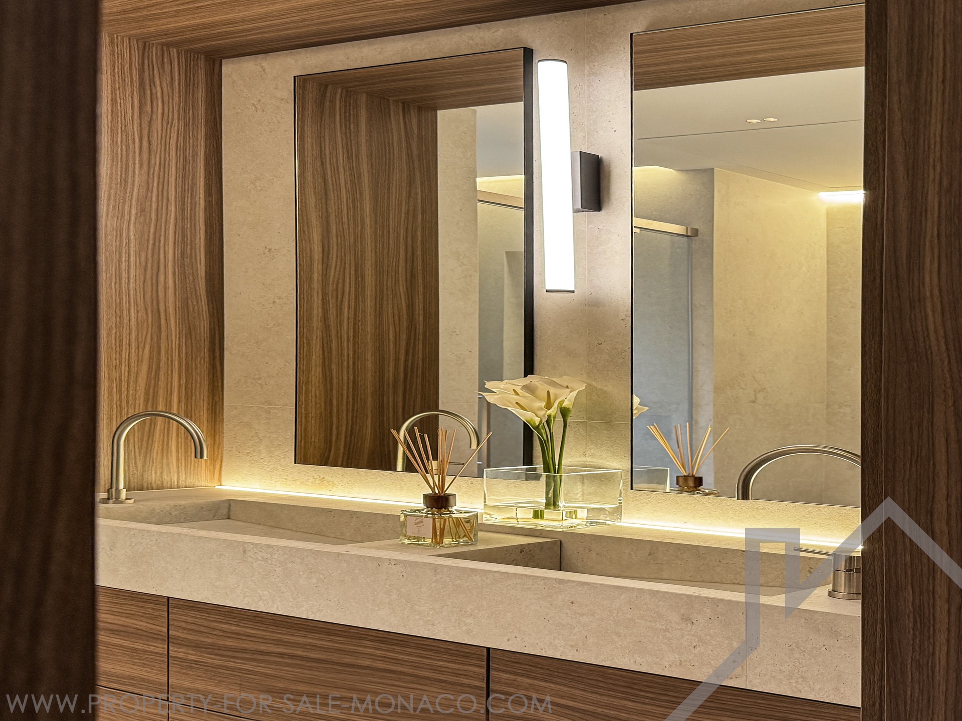 La propriété comprend deux chambres magnifiquement aménagées et trois salles de bains contemporaines, ainsi qu’une cuisine entièrement équipée alliant confort et style. Les espaces de vie lumineux et ouverts s’ouvrent sur une grande terrasse en angle, véritable point fort de la résidence. Depuis celle-ci, la vue panoramique s’étend sur le Port Hercule, les yachts scintillants et le célèbre Rocher de Monaco, offrant un spectacle époustouflant de jour comme de nuit.