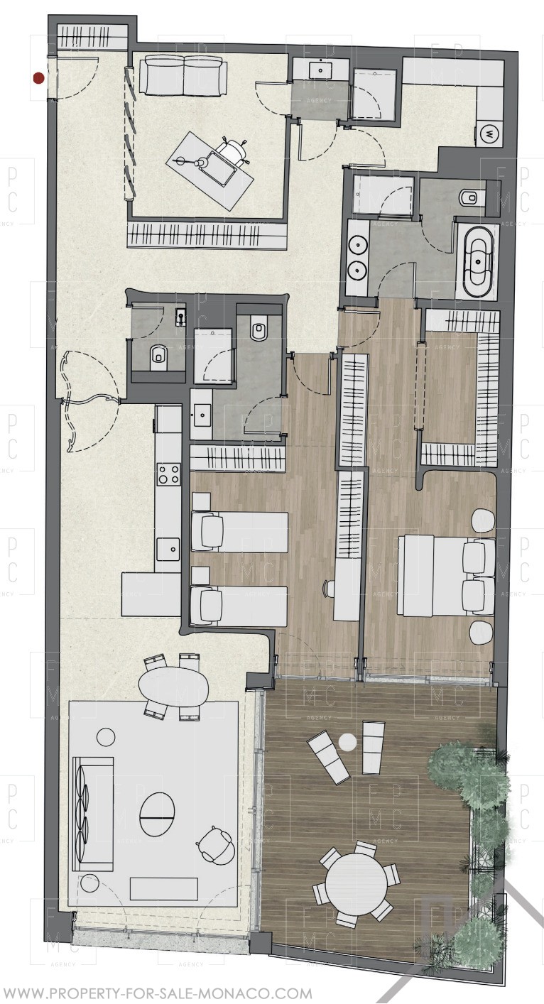 Ce spacieux appartement de 3 pièces bénéficie d'une spacieuse et profonde terrasse jouissant d'une magnifique vue panoramique sur la mer.
