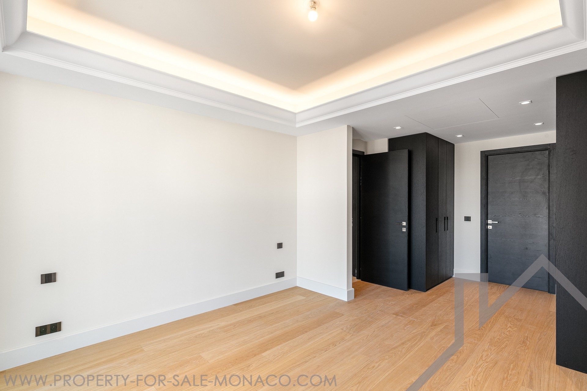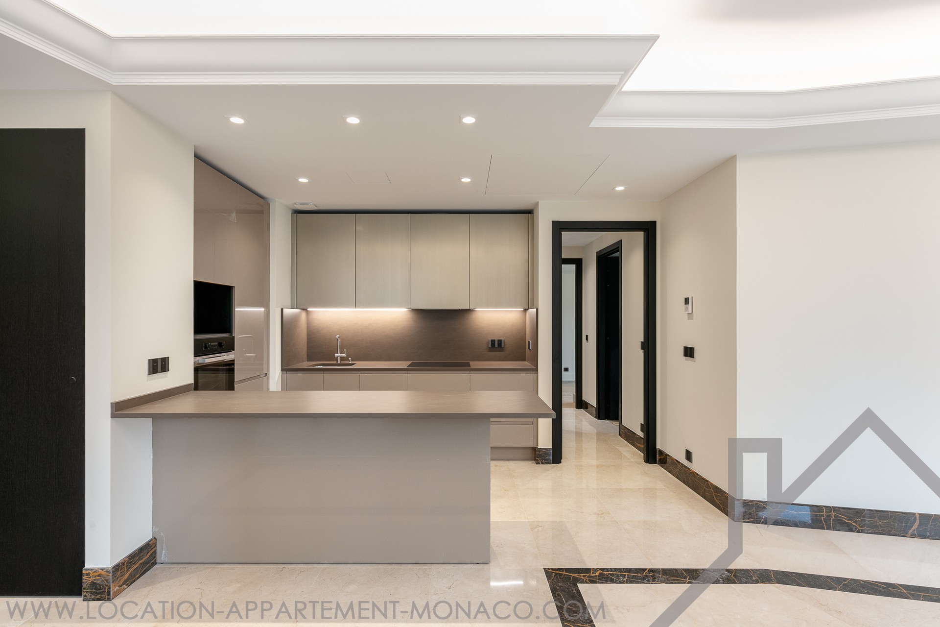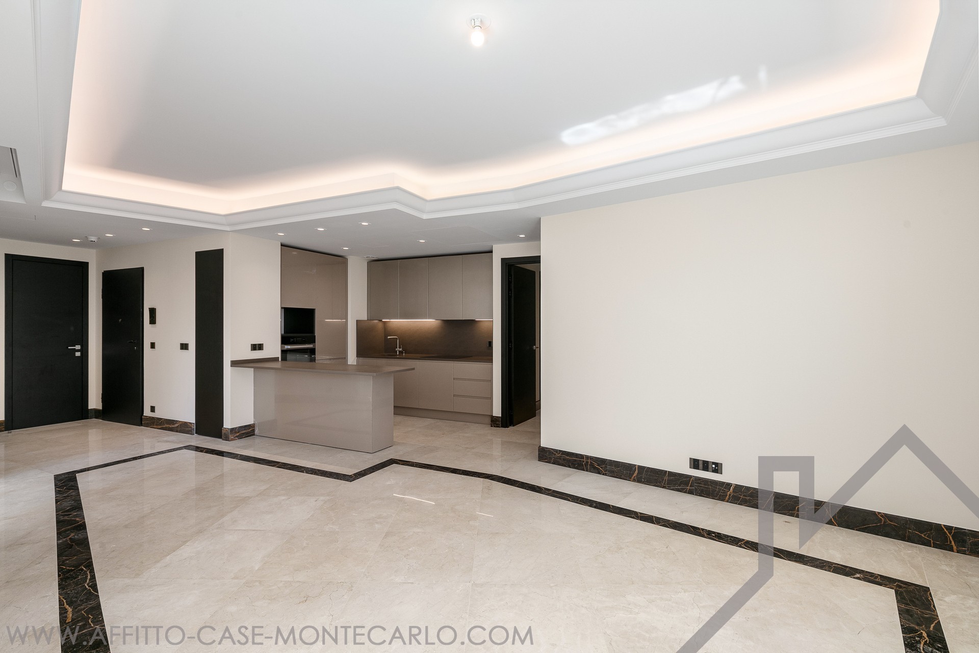 Prestations et finitions haut de gamme, revêtements en marbre (deux finitions), parquet en bois noble dans la chambre principale, corniches rétroéclairées, stuc mural, moulures décoratives, tête de lit moulurée, mobilier et menuiseries sur mesure.