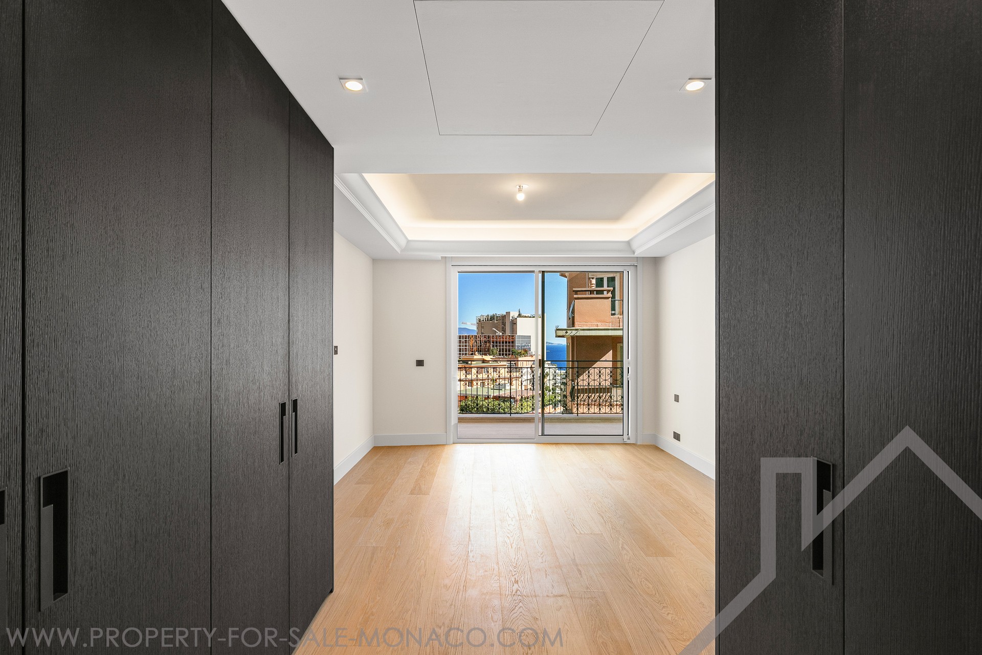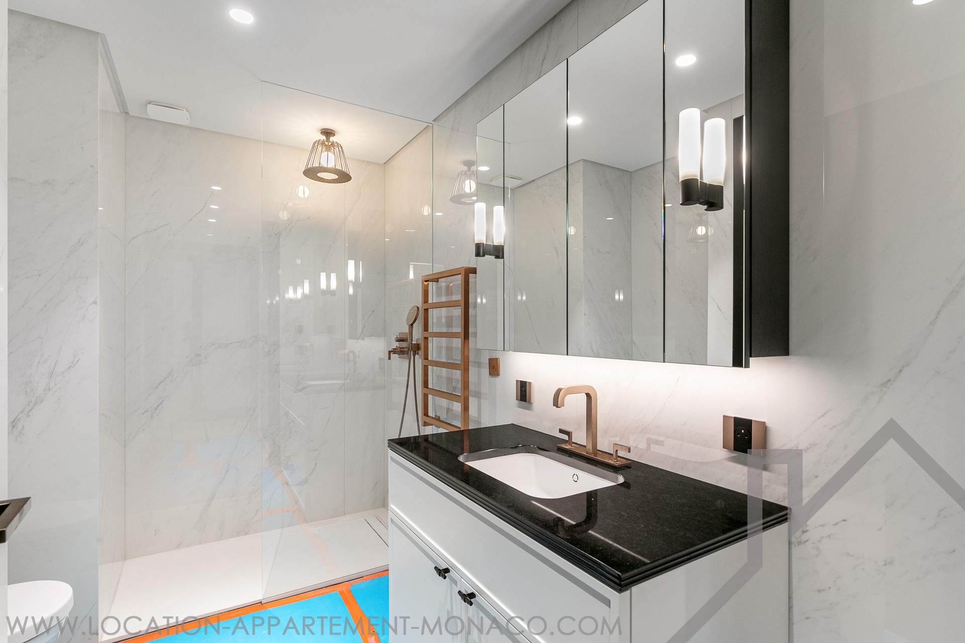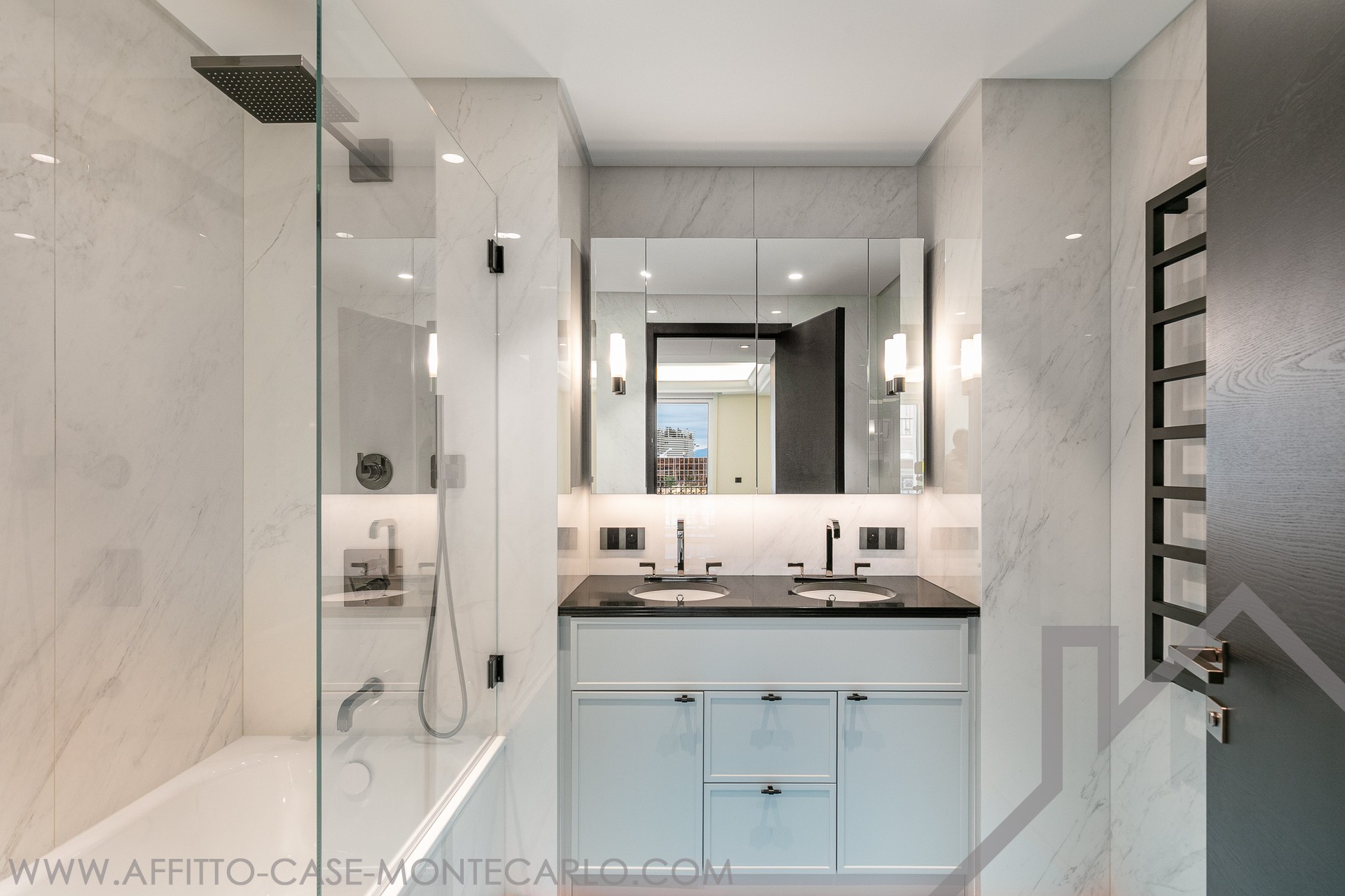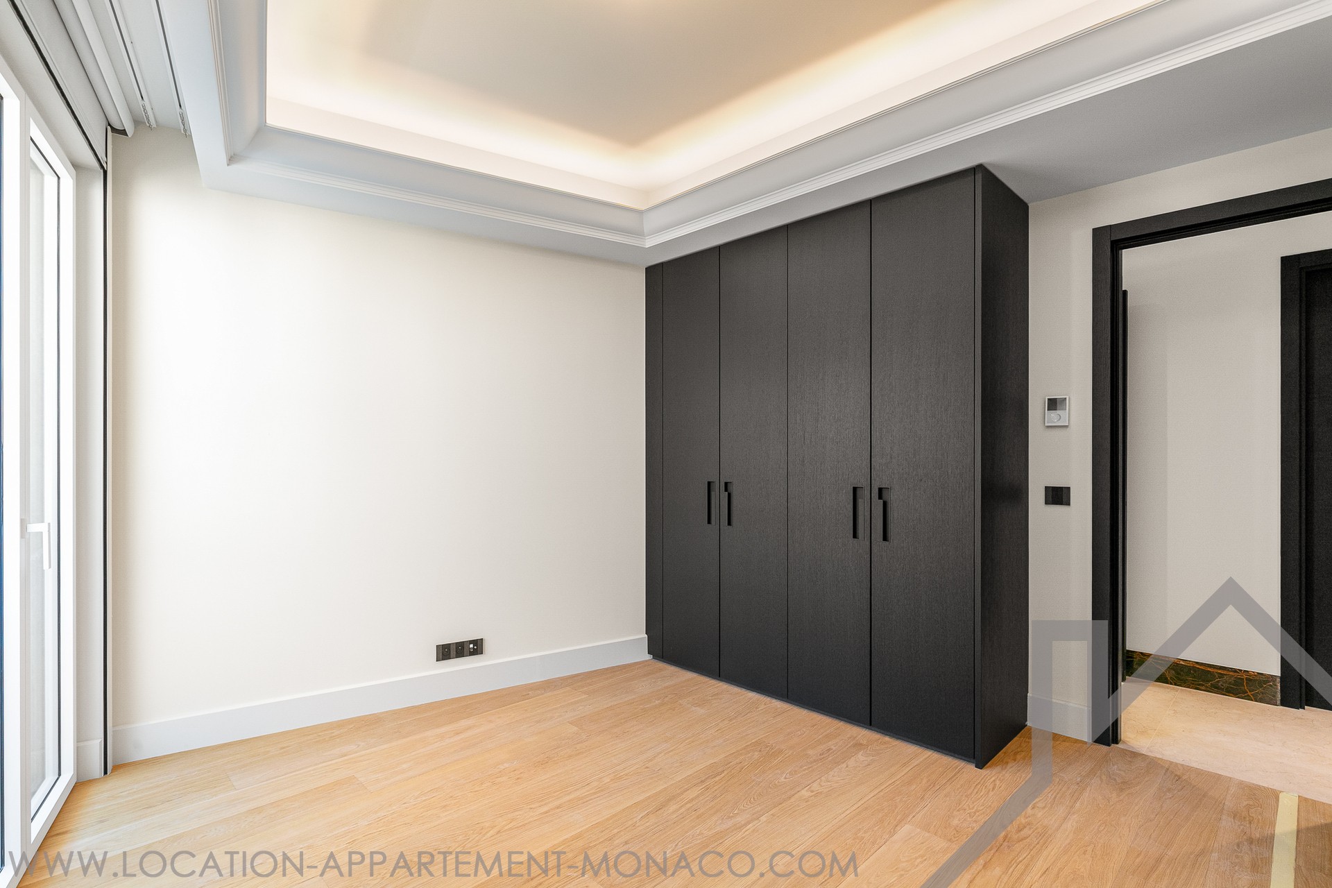 Prestations et finitions haut de gamme, revêtements en marbre (deux finitions), parquet en bois noble dans la chambre principale, corniches rétroéclairées, stuc mural, moulures décoratives, tête de lit moulurée, mobilier et menuiseries sur mesure.