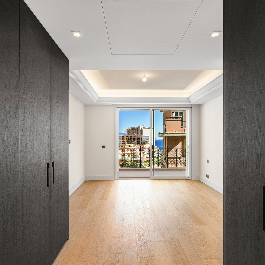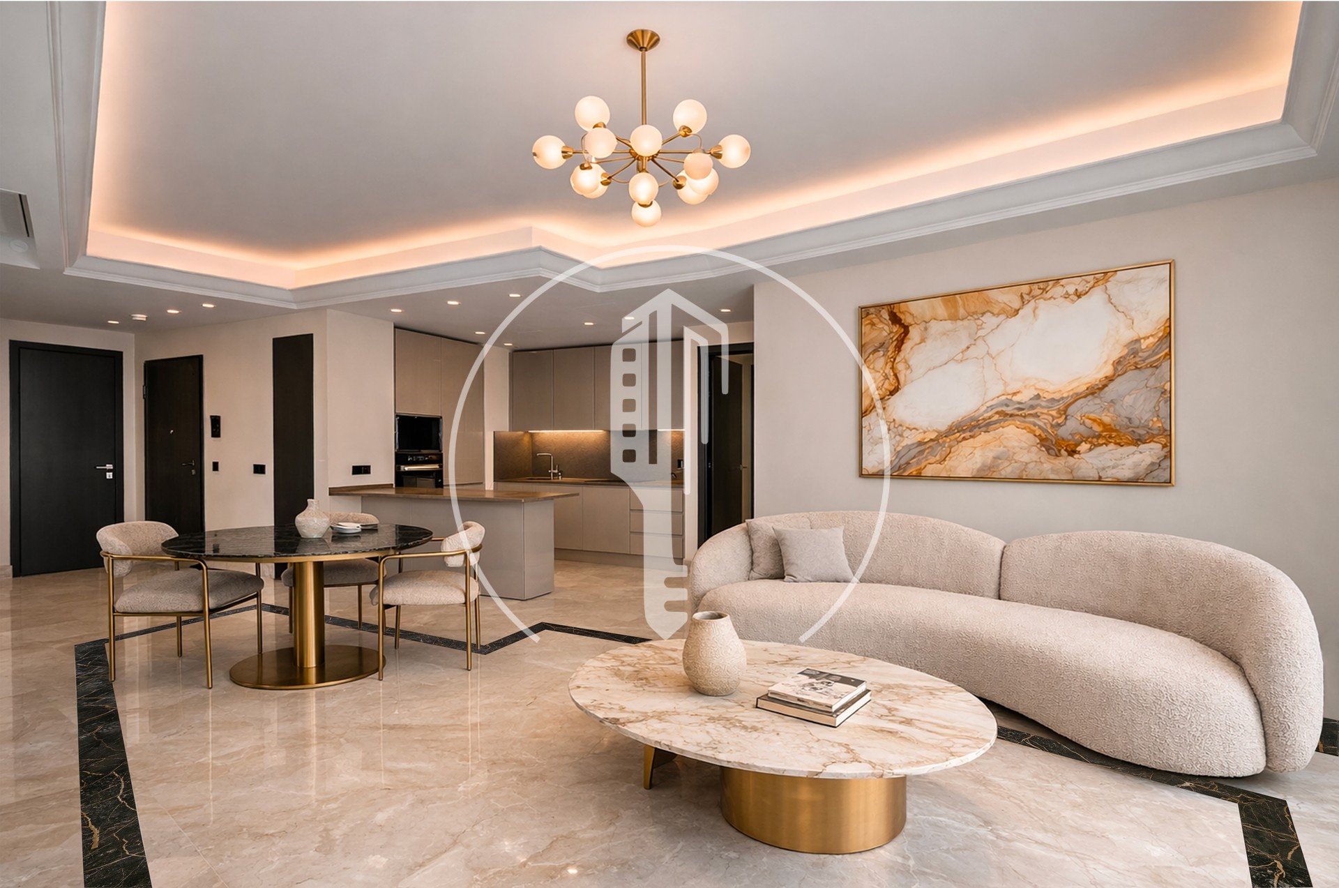 Prestations et finitions haut de gamme, revêtements en marbre (deux finitions), parquet en bois noble dans la chambre principale, corniches rétroéclairées, stuc mural, moulures décoratives, tête de lit moulurée, mobilier et menuiseries sur mesure.