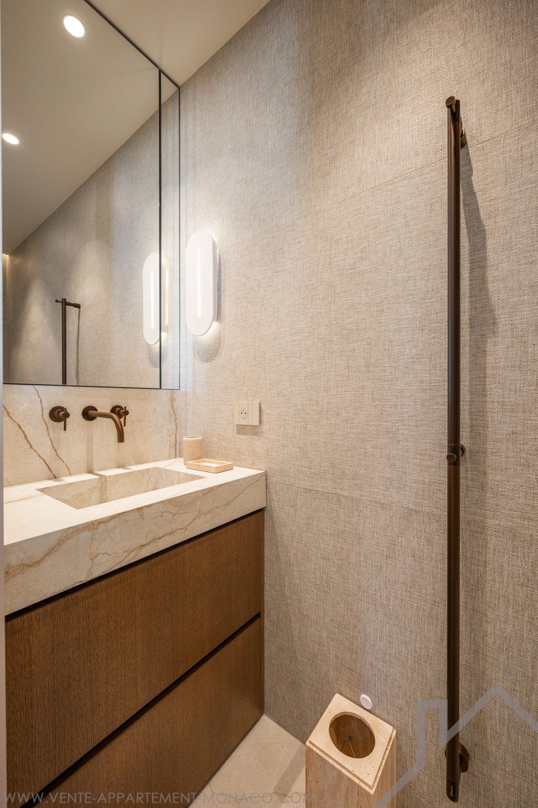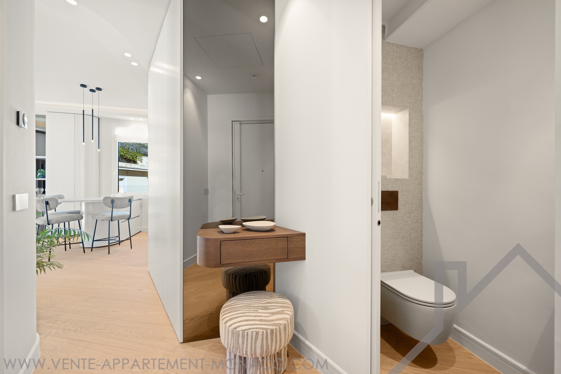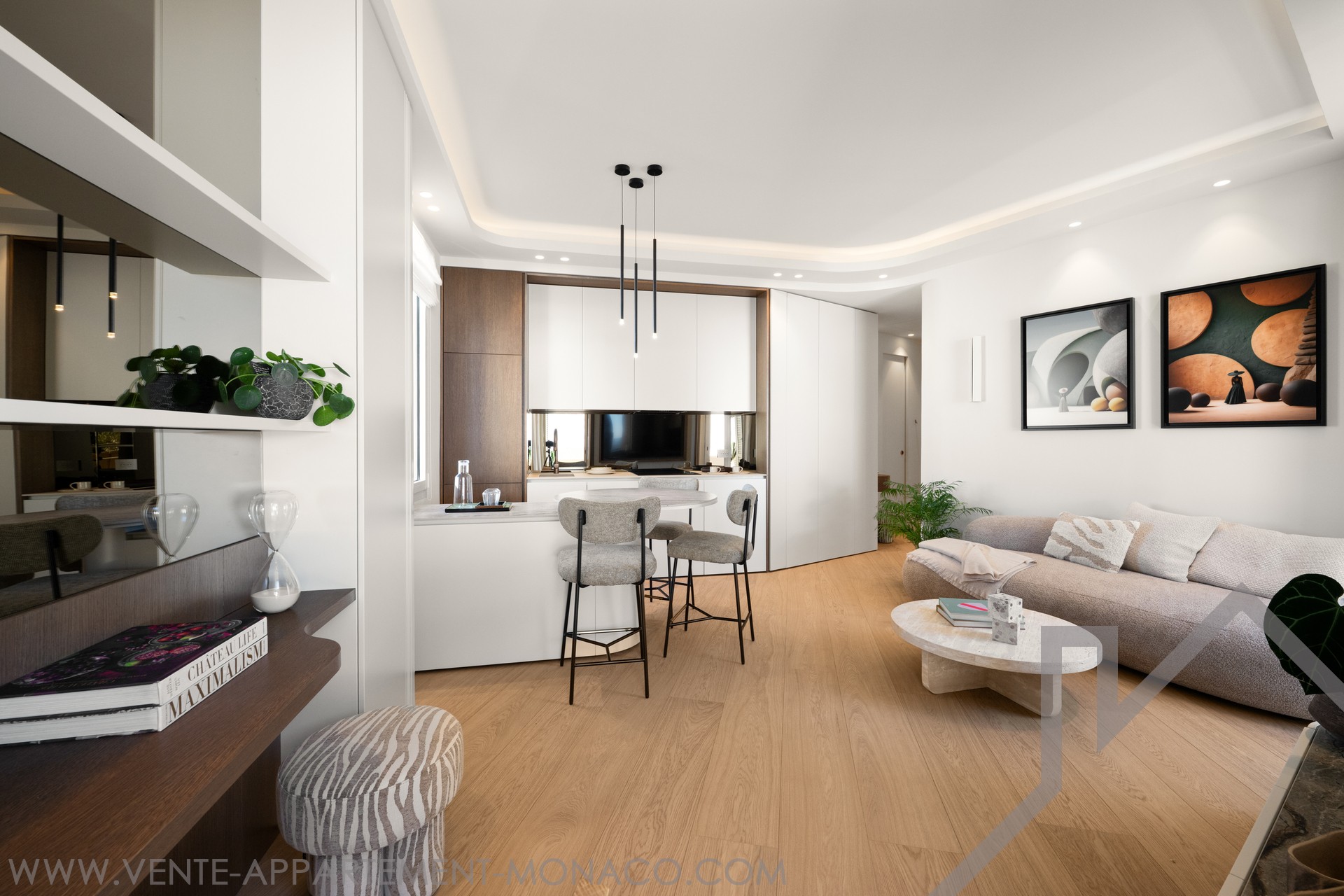 Ce flamboyant appartement de deux pièces, entièrement rénové, avec terrasse et bénéficiant d’une double exposition est-ouest, situé dans l’immeuble La Radieuse, dans le quartier de La Rousse Saint-Roman, se compose de :