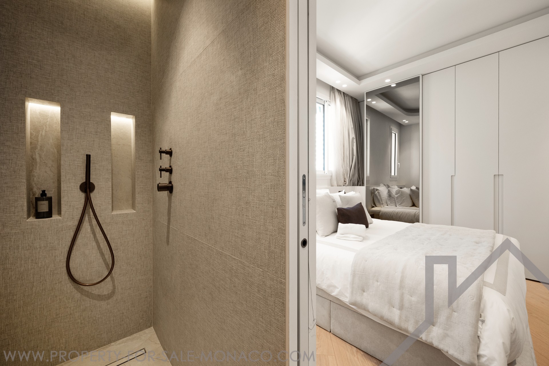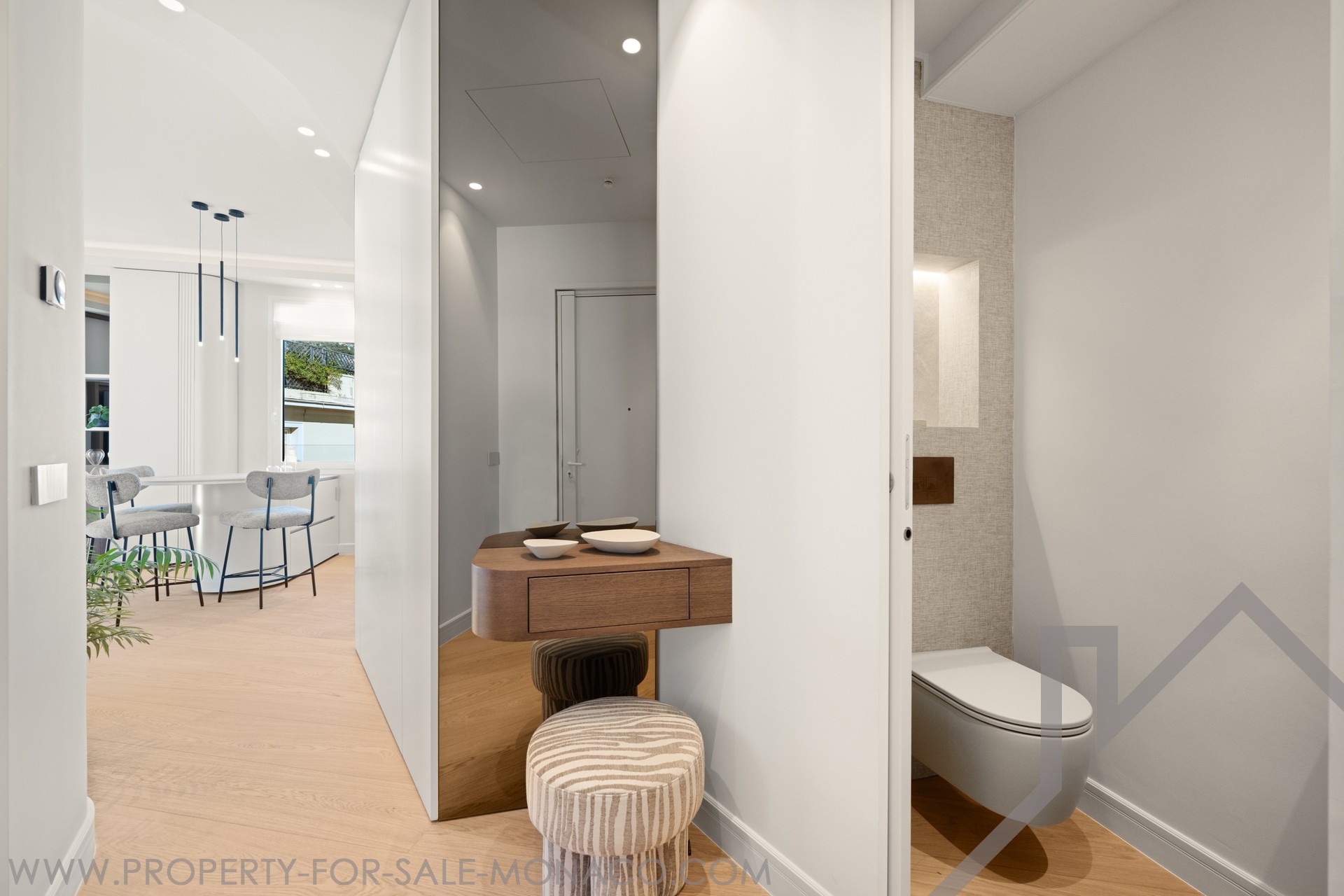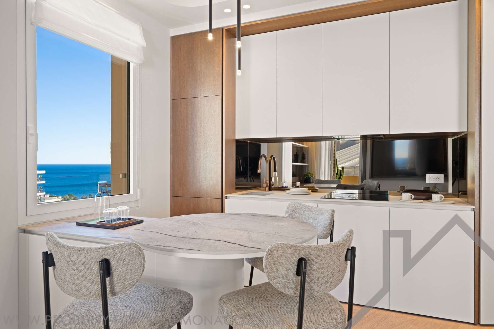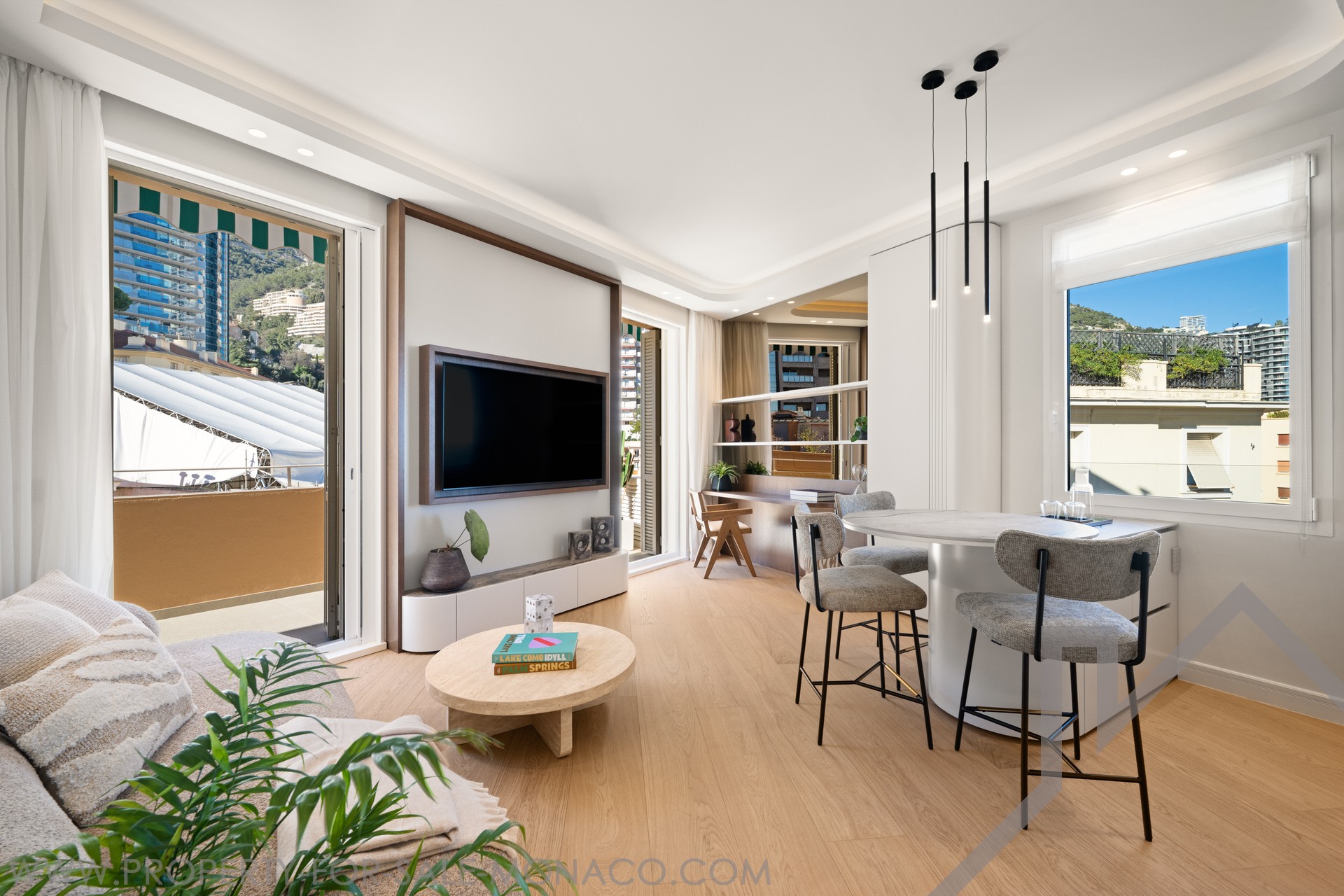 Ce flamboyant appartement de deux pièces, entièrement rénové, avec terrasse et bénéficiant d’une double exposition est-ouest, situé dans l’immeuble La Radieuse, dans le quartier de La Rousse Saint-Roman, se compose de :