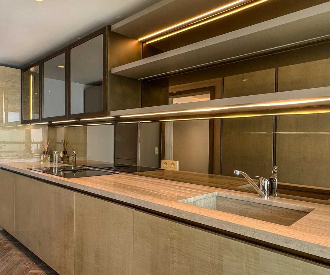 Le vaste séjour avec salle à manger est conçu en espace ouvert et séduit par ses baies vitrées toute hauteur, qui créent une atmosphère exceptionnellement lumineuse et accueillante. De grandes portes coulissantes en verre mènent à la terrasse privée, permettant une transition fluide entre l’intérieur et l’extérieur. Son orientation sud-est offre une vue panoramique imprenable et dégagée sur la mer Méditerranée.