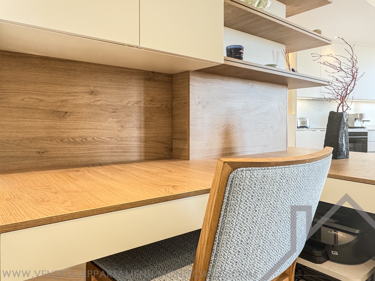 La surface habitable comprend une entrée accueillante, un séjour lumineux avec un petit espace bureau ainsi qu’une cuisine ouverte entièrement équipée. L’appartement dispose également d’une chambre confortable avec vue sur la mer et d’une salle de douche moderne attenante. Une agréable terrasse avec une magnifique vue sur la mer complète ce bien attrayant.