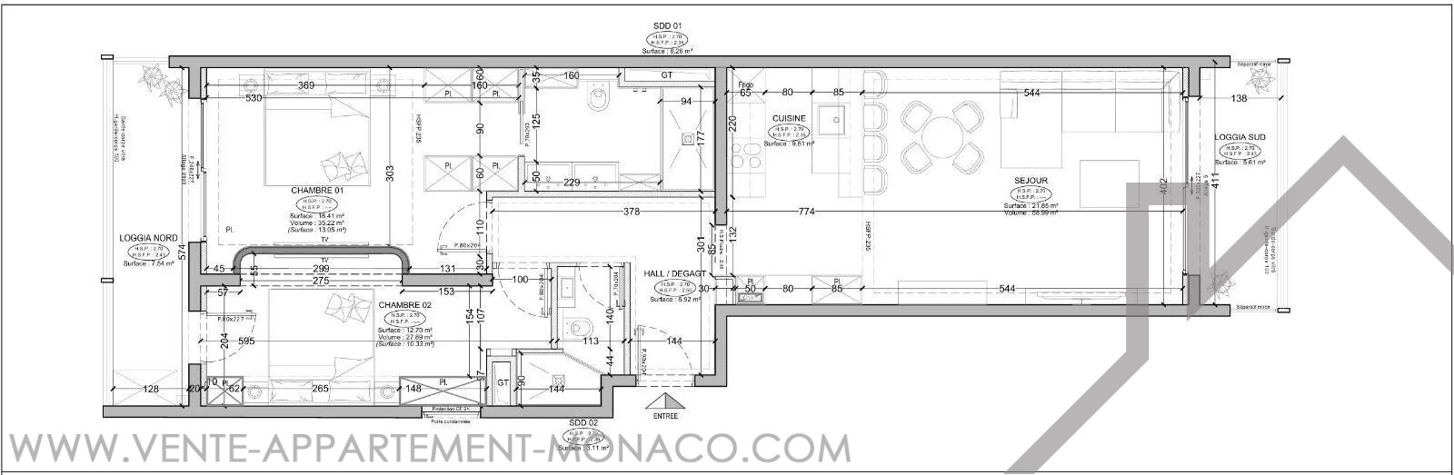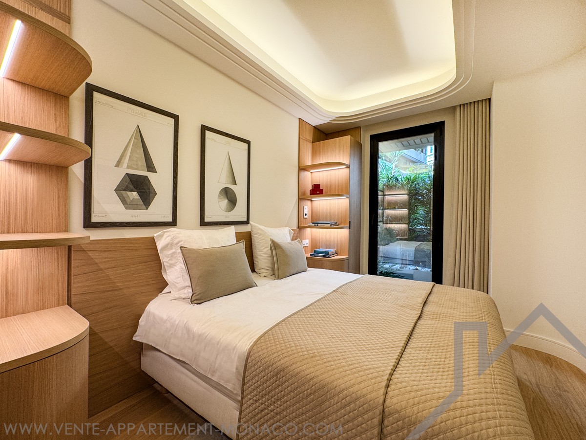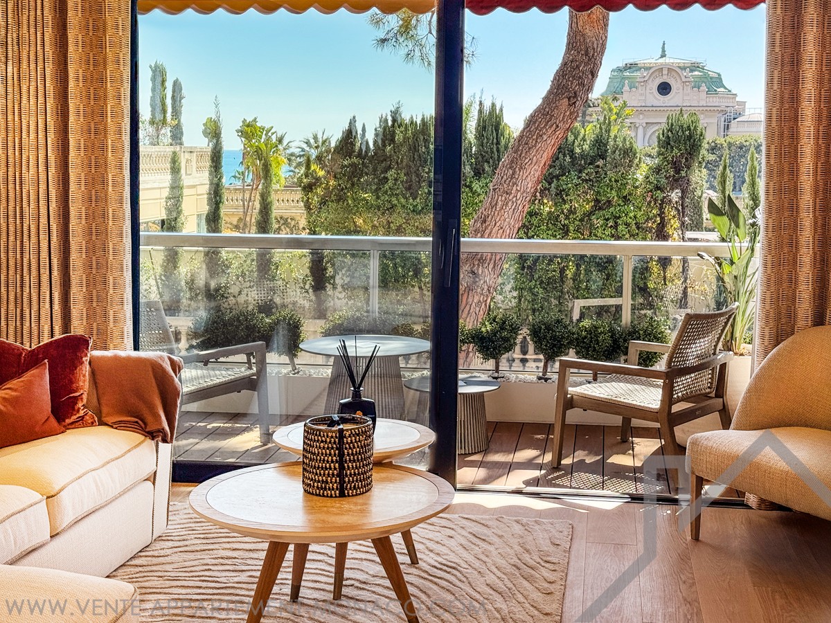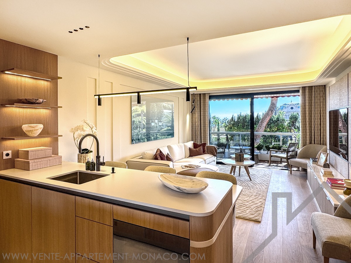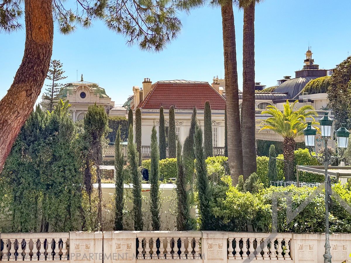 A l'avant, le salon et la cuisine s'ouvrent sur une profonde terrasse avec vue sur le Casino de Monaco. Les deux chambres s'ouvrent sur une seconde terrasse aménagée.