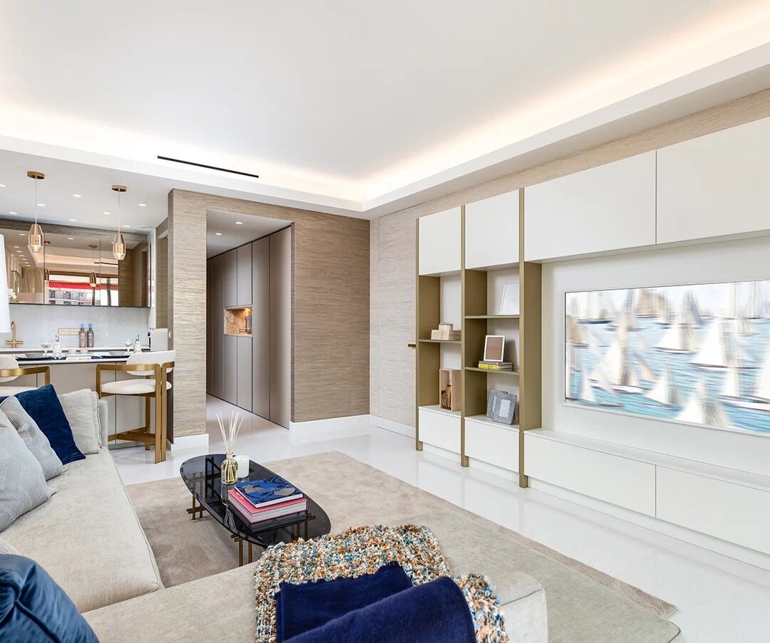 L'entrée de cet appartement laisse immédiatement entrevoir le raffinement du produit et se prolonge dans la lumineuse pièce de vie décorée et meublée avec une attention particulière apportée aux détails.