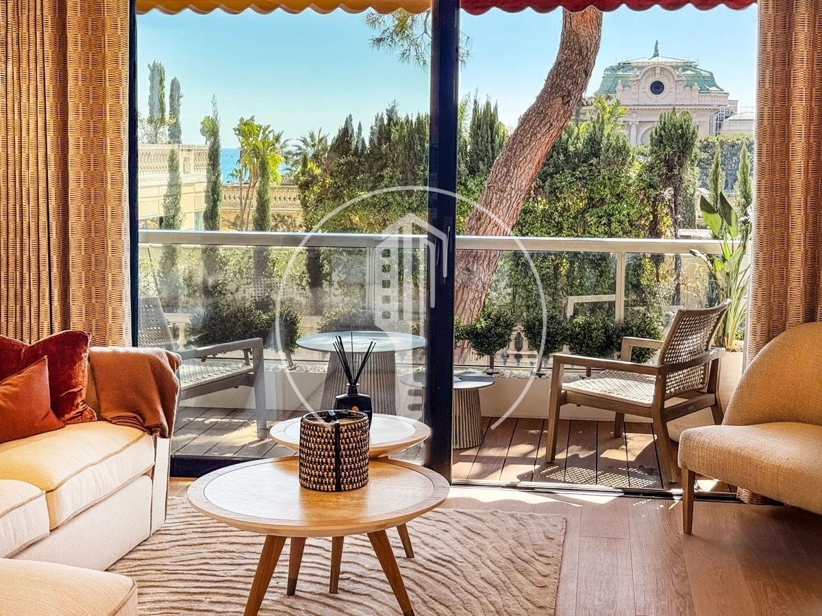 A l'avant, le salon et la cuisine s'ouvrent sur une profonde terrasse avec vue sur le Casino de Monaco. Les deux chambres s'ouvrent sur une seconde terrasse aménagée.