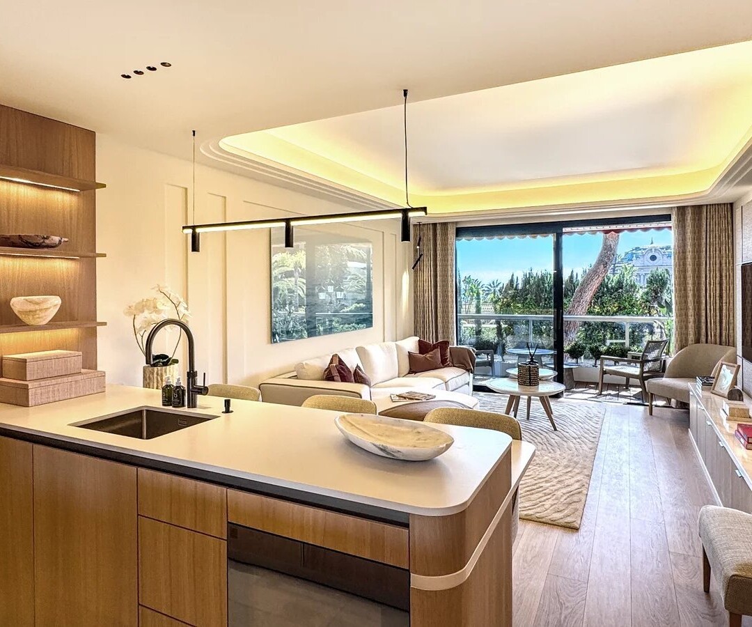 En entrant, vous découvrirez un élégant hall d'entrée qui donne sur un salon luxueux, avec une cuisine américaine Bulthaup. Le salon s'ouvre sur une terrasse paysagée offrant une vue sur la place du Casino. Le mobilier raffiné est complété par de magnifiques boiseries sur mesure.