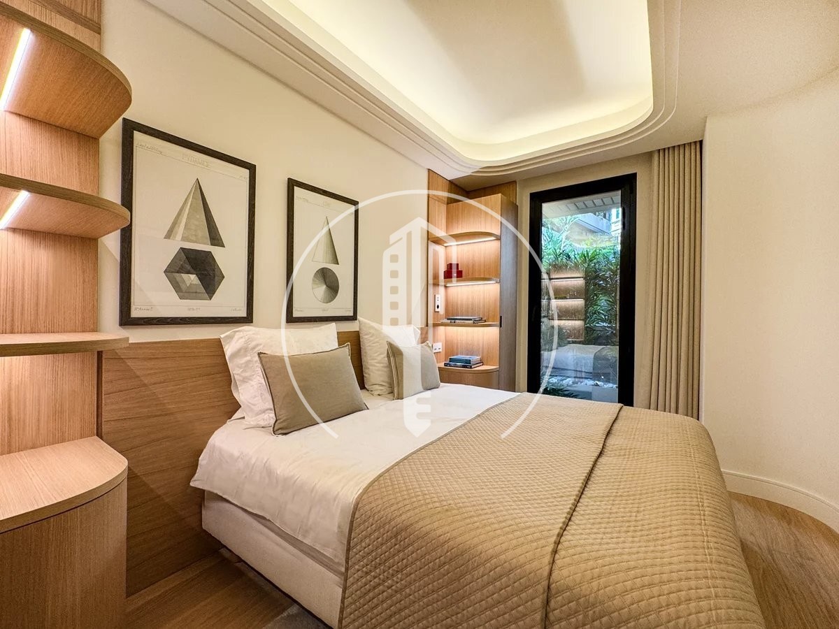 Les deux chambres sont spacieuses et lumineuses, avec un parquet en chêne clair créant une atmosphère chaleureuse, ainsi que des placards sur mesure. Les salles de bains présentent des finitions en marbre et un chauffage au sol pour un confort optimal.
