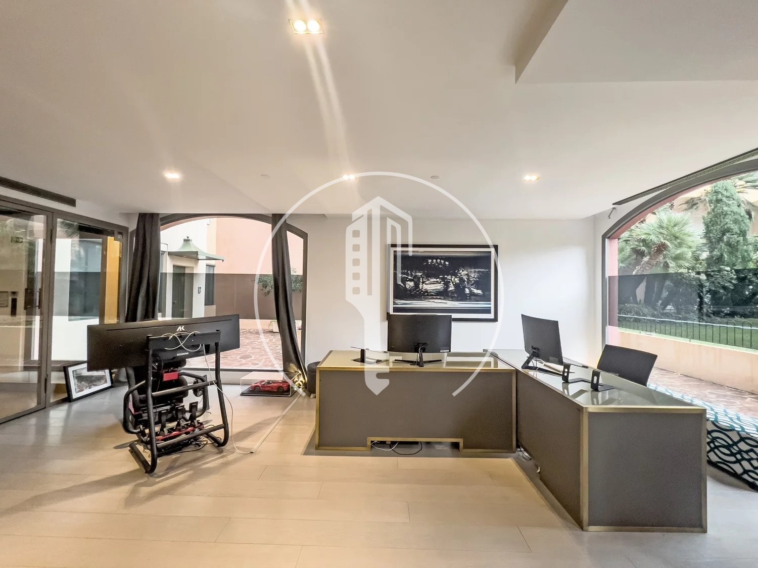 Grâce à ses grandes fenêtres d'angle, beaucoup de lumière naturelle pénètre dans le bureau. De là, vous avez une vue magnifique sur les jardins environnants et la mer.