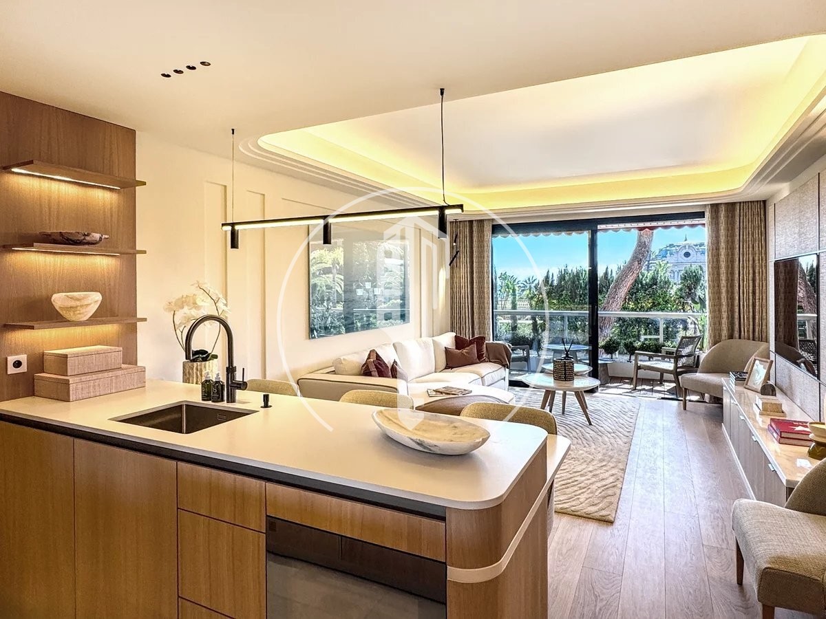 En entrant, vous découvrirez un élégant hall d'entrée qui donne sur un salon luxueux, avec une cuisine américaine Bulthaup. Le salon s'ouvre sur une terrasse paysagée offrant une vue sur la place du Casino. Le mobilier raffiné est complété par de magnifiques boiseries sur mesure.