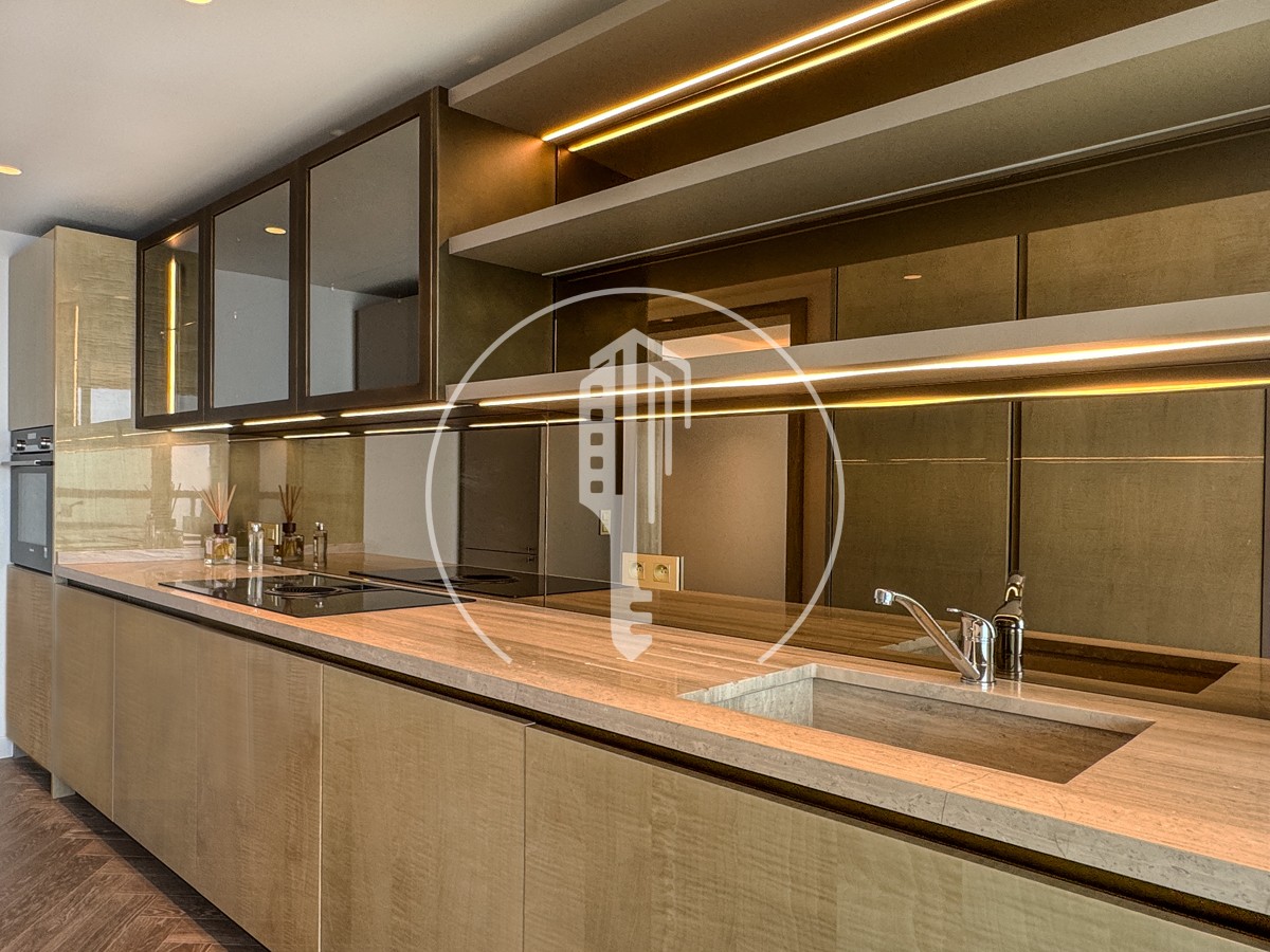 Le vaste séjour avec salle à manger est conçu en espace ouvert et séduit par ses baies vitrées toute hauteur, qui créent une atmosphère exceptionnellement lumineuse et accueillante. De grandes portes coulissantes en verre mènent à la terrasse privée, permettant une transition fluide entre l’intérieur et l’extérieur. Son orientation sud-est offre une vue panoramique imprenable et dégagée sur la mer Méditerranée.